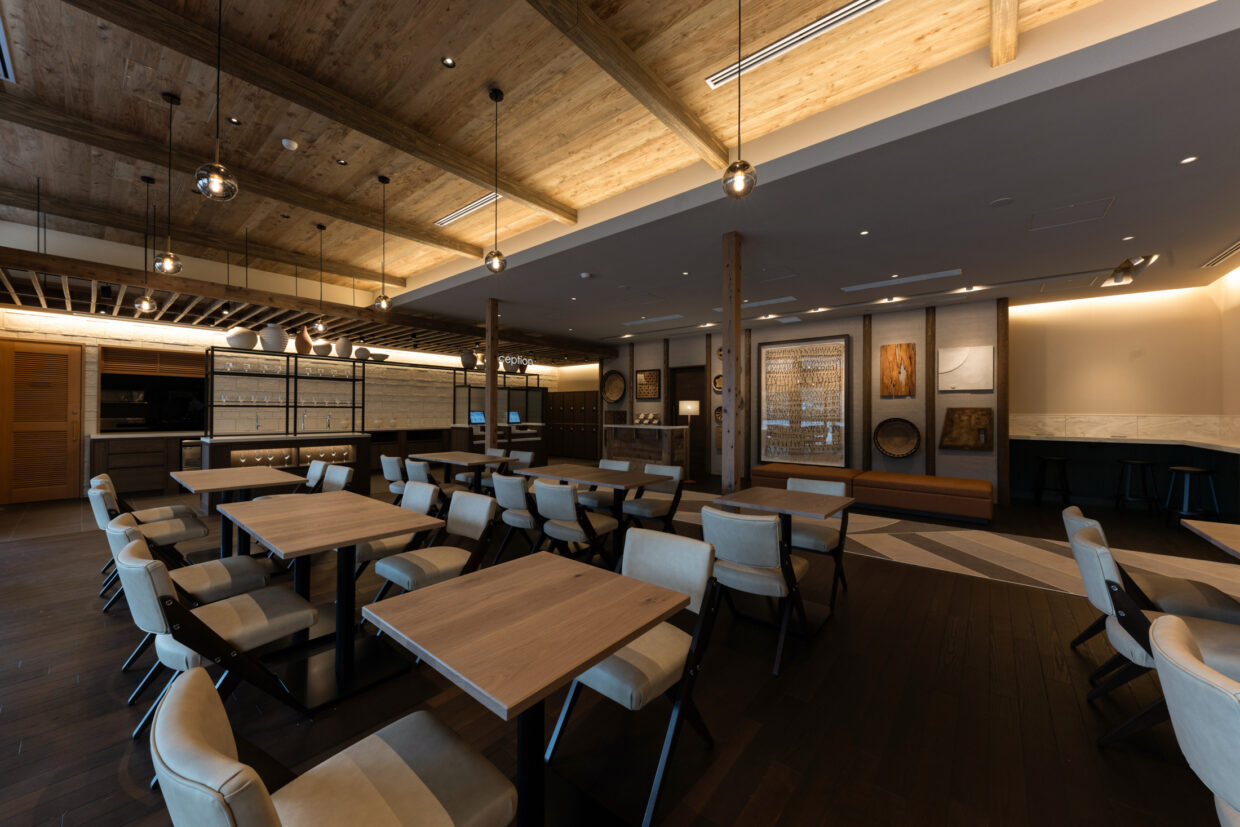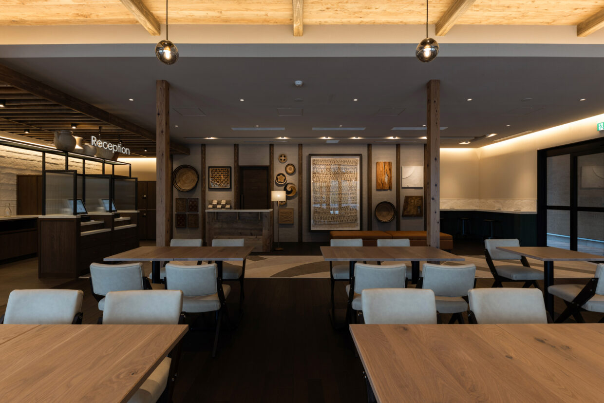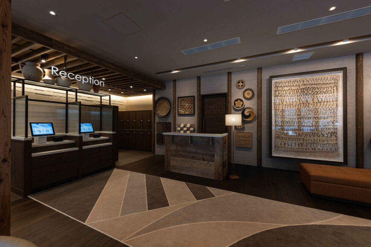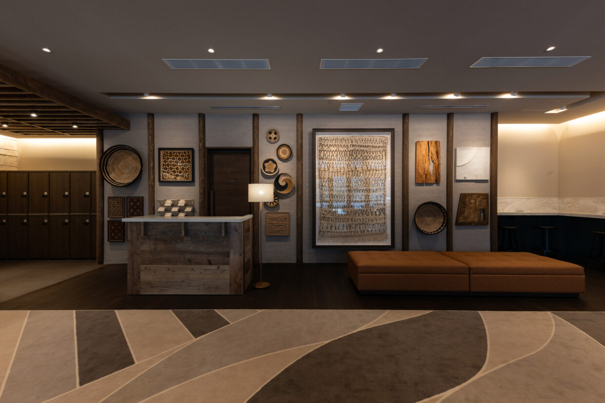- コンシェルジュカウンター/レセプションカウンター/ドリンクカウンター/カウンターテーブル/ウェイティングベンチ/テーブル/ベンチソファ/壁面ミラー/ロッカー