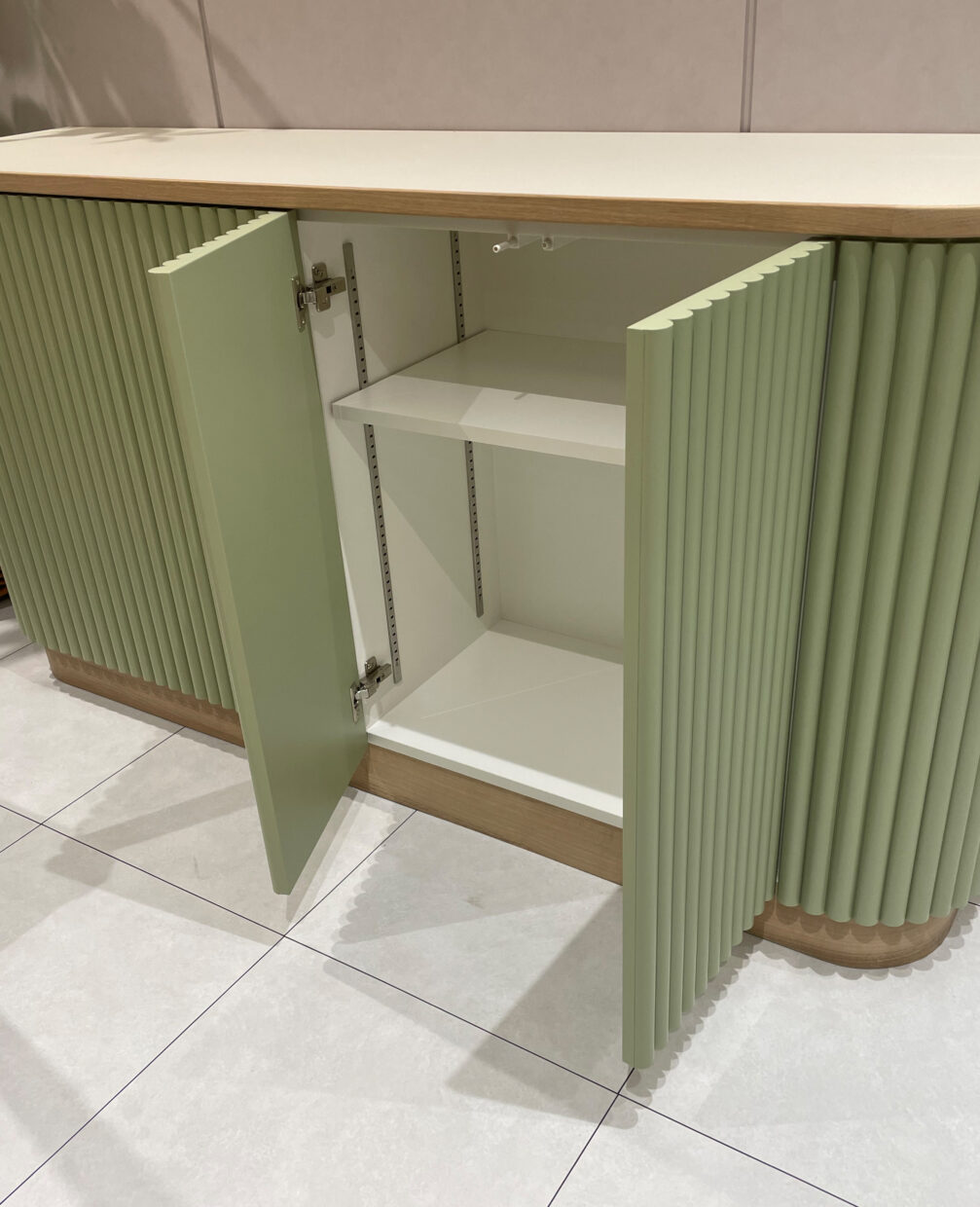弊社に依頼される家具は、難易度が高いものが多い。この時も、床の高さが違うところにからむ家具を製作した。また、スパンドリルというあまり家具には使用しない素材で製作し、これもまた、難易度が高かった。