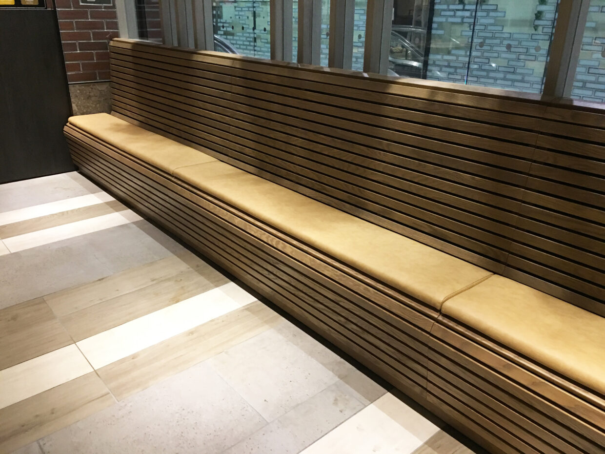 - 木桟の間隔設定やR寸法の検討を綿密に行い、意匠性と座り心地の両面で理想的なプロポーションとなるよう木桟寸法を決定