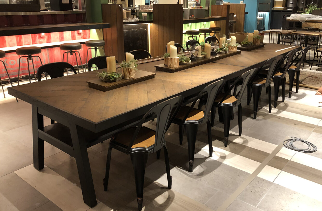 個性的な4つのお店が集まるフードホール。空間の力強い雰囲気に負けず、むしろ価値を引き上げる家具となるよう、設計・製作をしました。