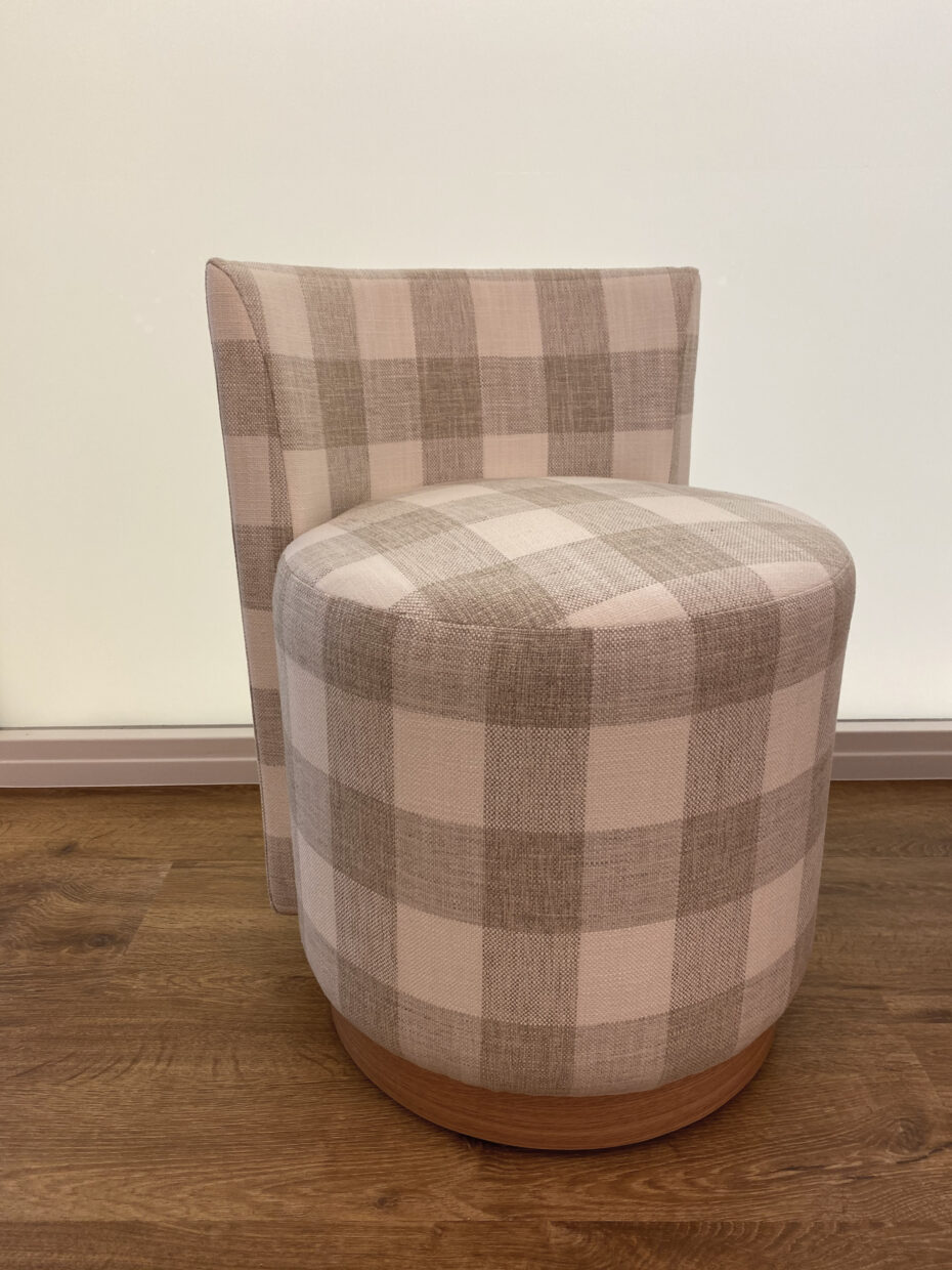 - 傾斜を持つ曲線の背と座面、そして異なる次元の面が交差する複雑な造形を崩さず、きれいに収まる座面クッションとなるよう製作